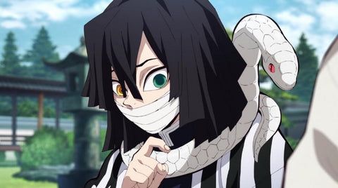 • Obanai Iguro (Serpent) – Austère et méfiant, sa loyauté au Corps est sans faille. Sa froideur, parfois dure, s’adoucit dans son lien secret avec Mitsuri, montrant la sensibilité d’un homme rongé par ses propres chaînes.