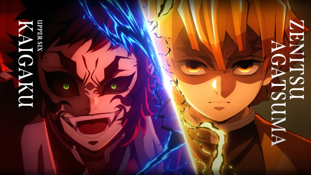 • Kaigaku (successeur de la Lune Supérieure Six) – Ancien disciple du Souffle de la Foudre, il symbolise la trahison et la rancune. Incapable d’accepter ses limites, il choisit la voie de la facilité en devenant démon. Son destin contraste avec celui de Zenitsu : là où ce dernier progresse grâce à sa persévérance, Kaigaku sombre dans l’orgueil et la jalousie.